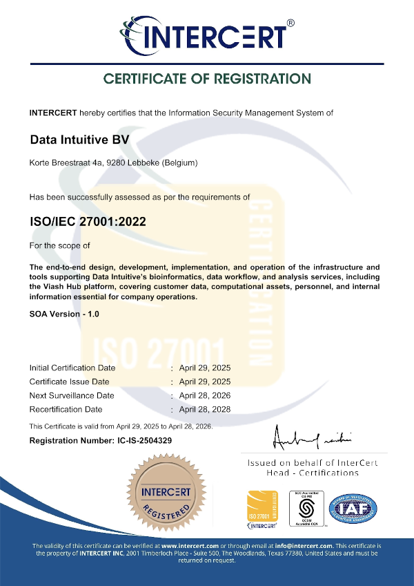 The certification applies to the end-to-end design, development, implementation, and operation of the infrastructure and tools supporting Data Intuitive’s bioinformatics, data workflow, and analysis services, including the Viash Hub platform. The scope includes customer data, computational assets, personnel, and internal information essential for company operations.