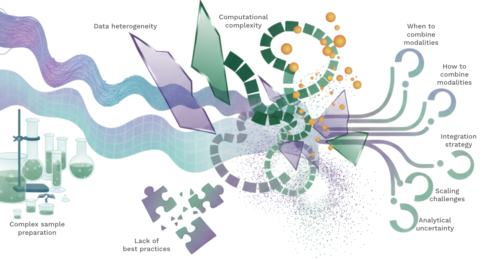While multiomics opens up a range of possibilities, it also comes with a new set of challenges. Multiomics assays are often more expensive and can require more complex sample preparation steps. Computational analysis of multiomics can be significantly more complex and requires analysts to become familiar with several tool sets and algorithms as each modality has its own processing steps, assumptions and limitations. Less common modalities often do not have established best practices for analysis and require more experimentation with different approaches. Scale also presents a challenge, as does the variety of file types and measured values. When and how to combine modalities is a particularly crucial decision. Depending on the technologies used and the research question, it may make sense to concatenate measurements before analysis, use an integration method to place them in a shared space or to analyse each modality separately and combine the results.